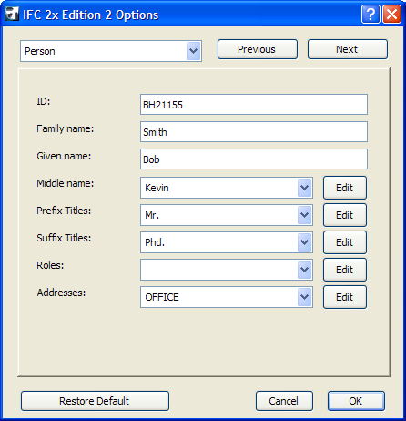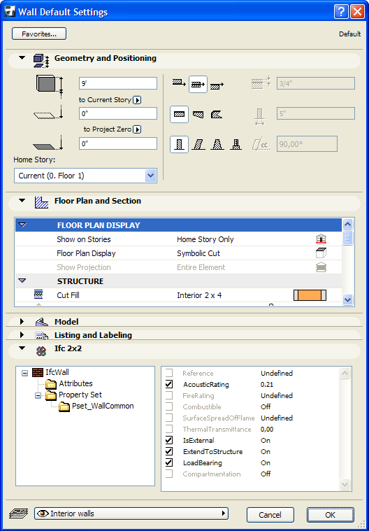 You can customize your Tool Settings dialog boxes in the Work Environment (from the Options \ Work Environment menu, select the Tool Settings Dialog Boxes... command) to include the IFC 2X2 panel. Use the controls in this panel to edit the default or the selected element's IFC attributes and property sets.