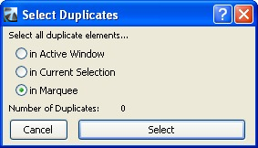 The Select... command will select and highlight all duplicated elements in the active window. If you placed a marquee in the window, or you have selected elements before evoking the command, then you can limit the range of the command to the marquee area or the selected elements. Only duplicates will be selected, the original item will not be affected.